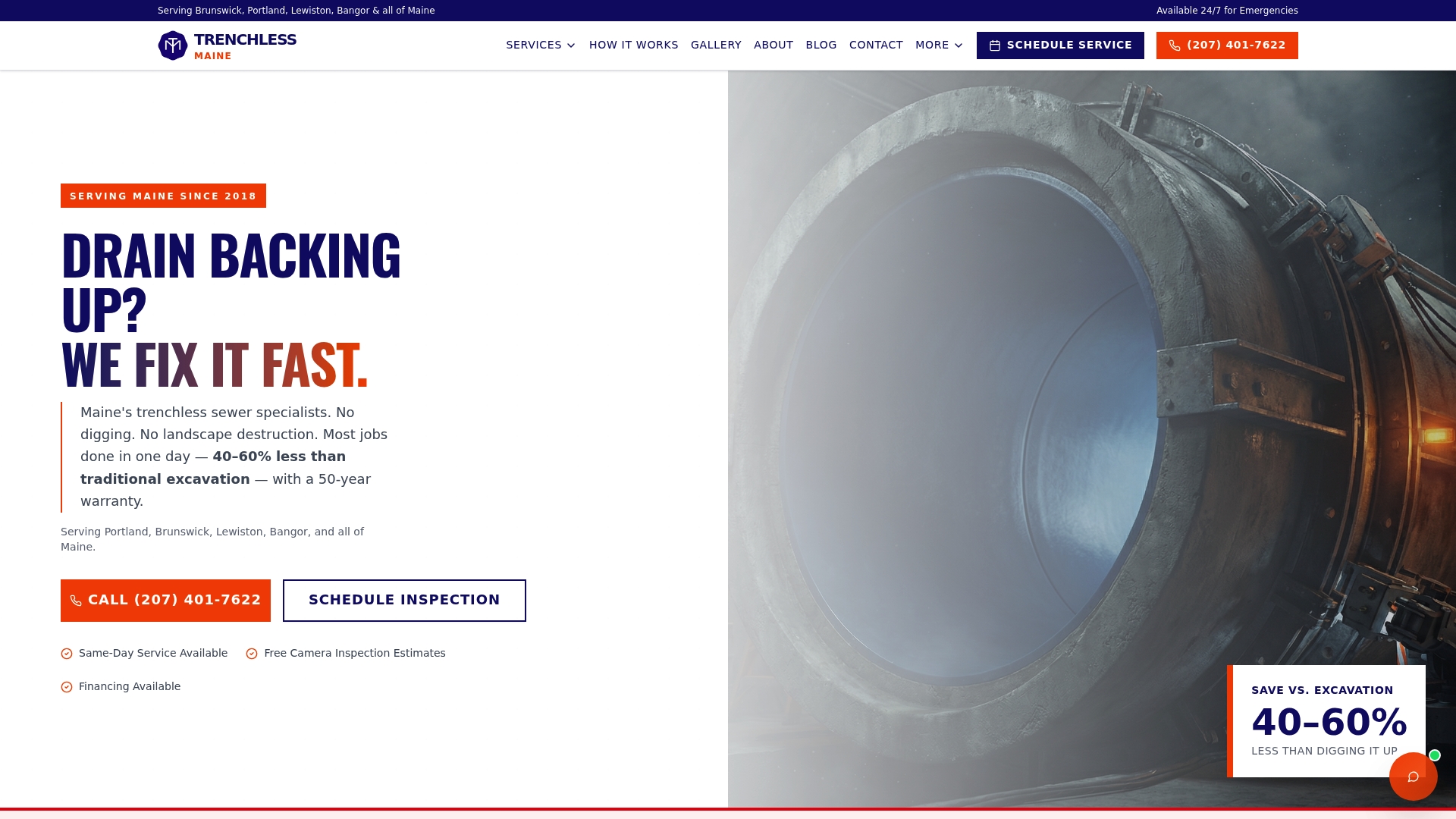 This provider delivers practical alternatives to open excavation when pipes are suitable for trenchless methods, but service availability outside Florida is limited and may rule it out for many Maine homeowners.