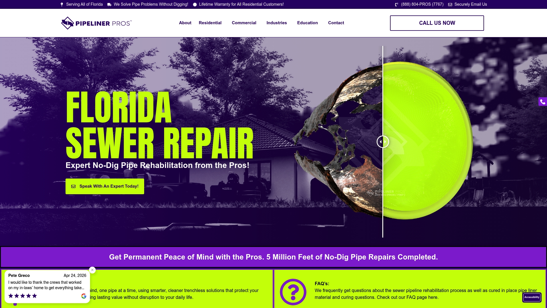 Pipeliner Pros focuses on trenchless pipe repair across Florida, offering fast, low disruption solutions with a lifetime warranty for residential work. The company emphasizes eco friendly, long lasting repairs and has completed millions of feet of pipe rehabilitation.