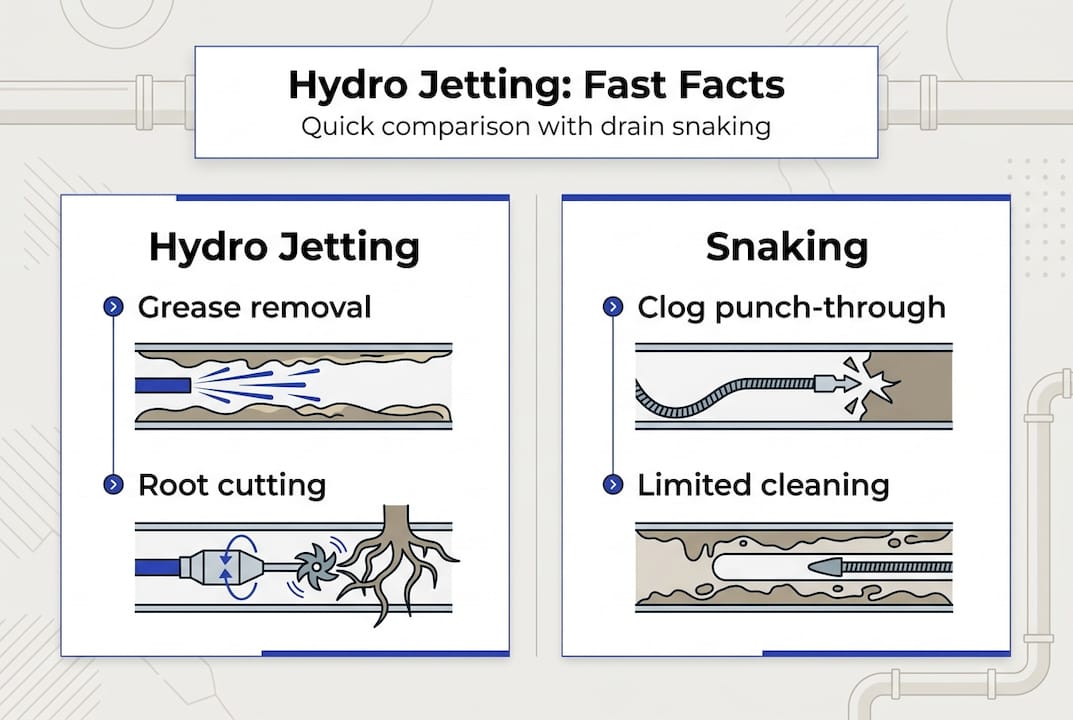 | Factor | Hydro jetting | Traditional snaking | Chemical cleaning |
