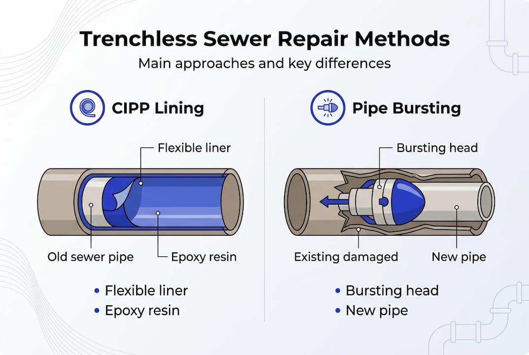 - Main trenchless methods: CIPP lining vs. pipe bursting